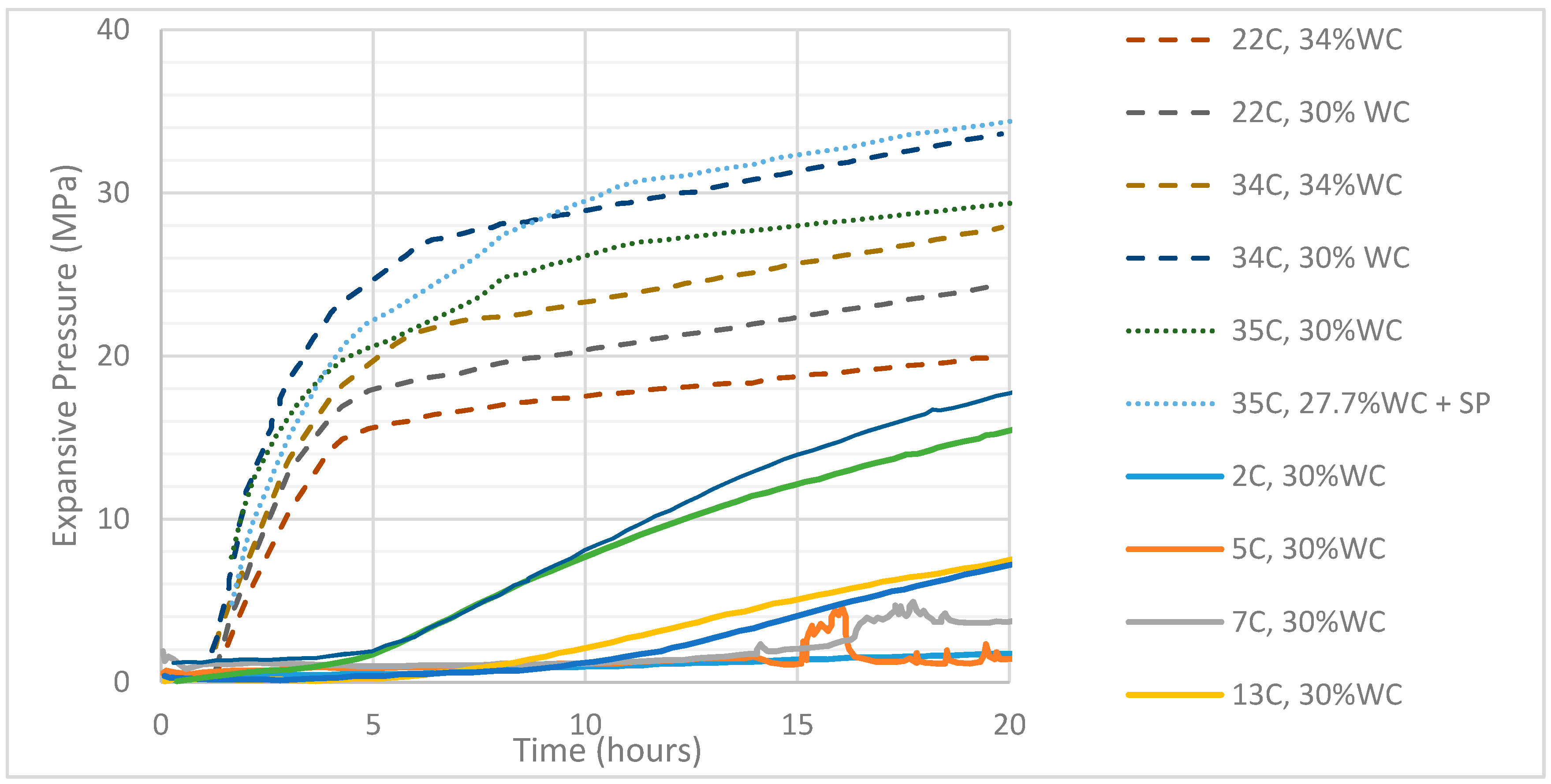 Following the work of Hinze and Brown [41], Hinze and Nelson [38] conducted experiments to improve the performance of SCDA by further reducing the manufacturer recommended minimum water content of 30%. The water content was reduced to 27.7% and the workability of the mix was maintained by using 0.0132 mL/g dose super-plasticizer. The results obtained for tests conducted at 35 °C are shown in (Figure 2), which clearly shows the negative influence created by the water content on SCDA expansive pressure generation. Results of SCDA with 30% moisture content at 34 °C [41] showed a higher rate of pressure generation compared to the results of Hinze and Nelson [38] due to the difference in bore sizes used. According to Hinze and Nelson [38], reduction of SCDA water content, however, only causes a marginal increment in the expansive pressure at the expense of additional material. As far as rock fragmentation is concerned, reduced Water content will only reduce the demolition time slightly and may not be desirable in an economic point of view.