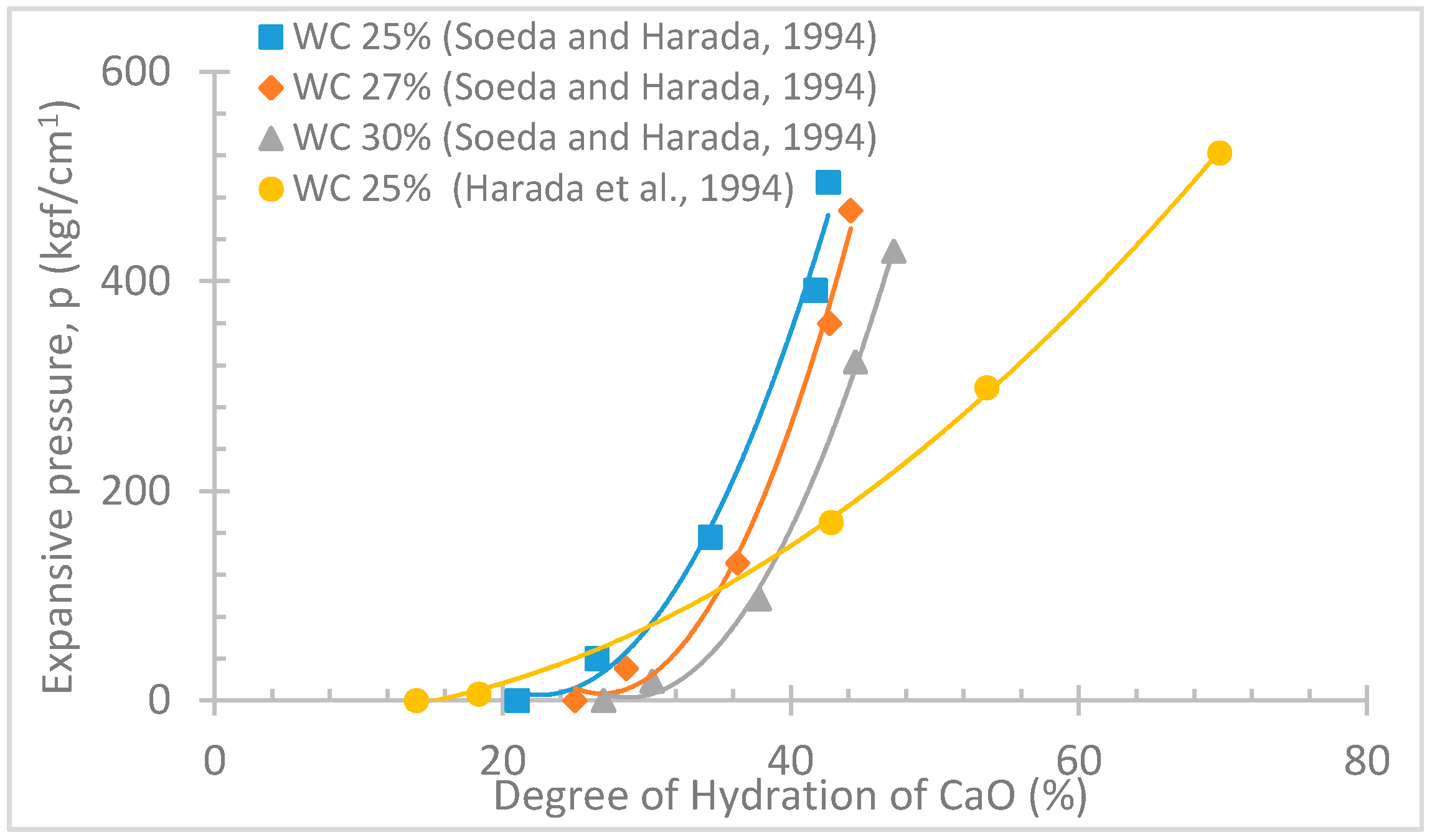 An extension of this study was carried out by Soeda and Harada [51] by changing the water content of SCDA. They found that the expansive pressure generated in SCDA is not only Ca(OH)2 quantity dependent but also it is Ca(OH)2 concentration dependent (Figure 3), where at higher water contents a larger degree of hydration is found to be required in SCDA to produce a particular expansive pressures, which will be more comprehensively explained in a later section (volume expansion mechanism of SCDA). As shown in Figure 3, there is a significant deviation in the relationship between the degree of hydration and the expansive pressure of SCDA between the results interpreted by Harada et al. [37] and Soeda and Harada [51]. This may be due to the difference in how the content of Ca(OH)2 was calculated at 100% hydration of SCDA was obtained. The Ca(OH)2 content of SCDA at 100% hydration was obtained by steam curing for 3 days by Harada et al. [37], whereas no specific information on how the content of Ca(OH)2 at the end of hydration is given by Soeda and Harada [51].