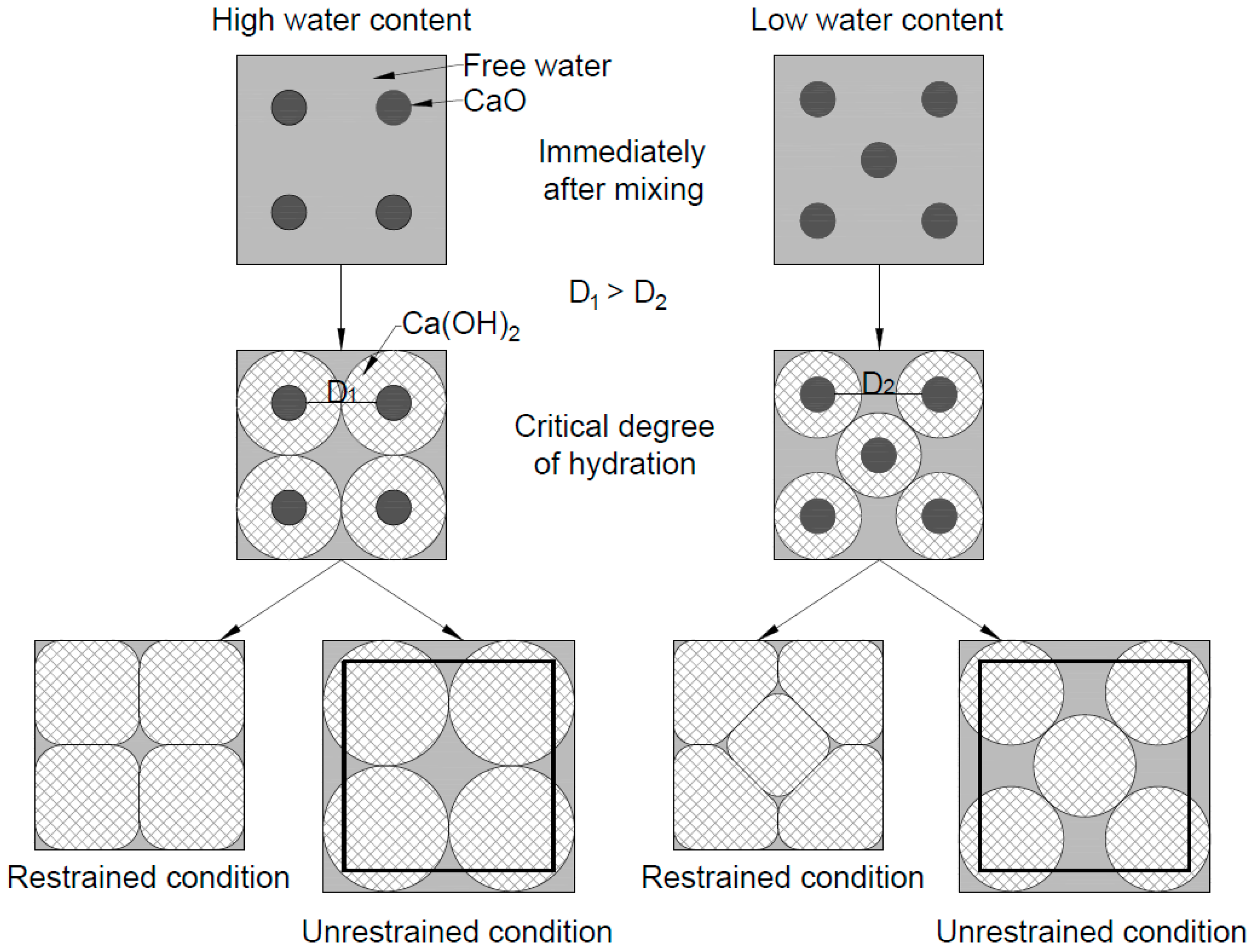 The effect of moisture content on expansive pressure development is also critical. The requirement of higher degree of hydration in the presence of greater water contents [51] has been explained by Shalom’s spherical model [55,57,66]. The mechanism described here has a close resemblance to the explanation given by Chatterji [56], which also explains the large pressure increments occur in SCDAs in the presence of lower moisture content. As shown in Figure 5 hydration of CaO results in the growth of solid particles, which come into contact with each other at a point, known as the critical degree of hydration. Beyond this point, further growth of solid particles results in the generation of expansive pressure under a confined condition. At lower water contents, a larger particle density (D1 > D2, Figure 5) is occurred producing smaller distances between neighboring particles [51] and therefore, a lower degree of hydration brings particles into contact enabling early generation of expansive pressures in SCDAs.