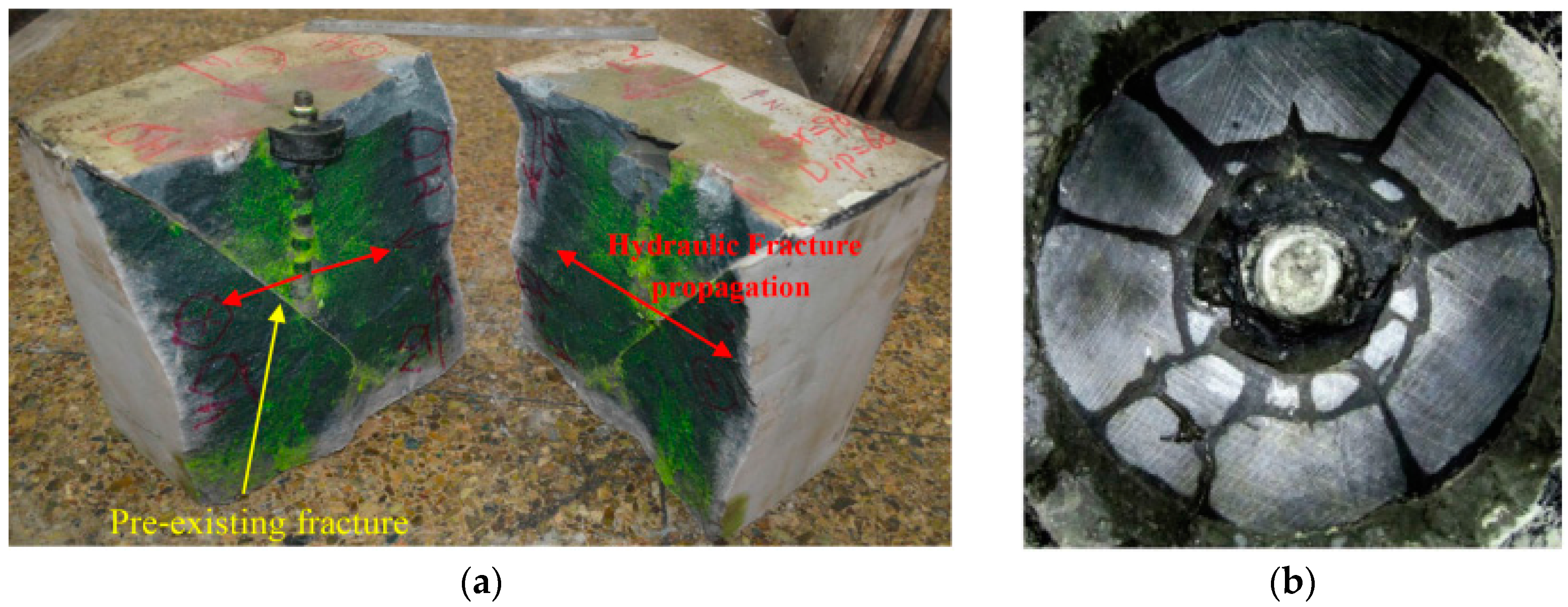 - Dehghan, A.N.; Goshtasbi, K.; Ahangari, K.; Jin, Y. Experimental investigation of hydraulic fracture propagation in fractured blocks. Bull. Eng. Geol. Environ. 2015, 74, 887–895. [Google Scholar] [CrossRef]