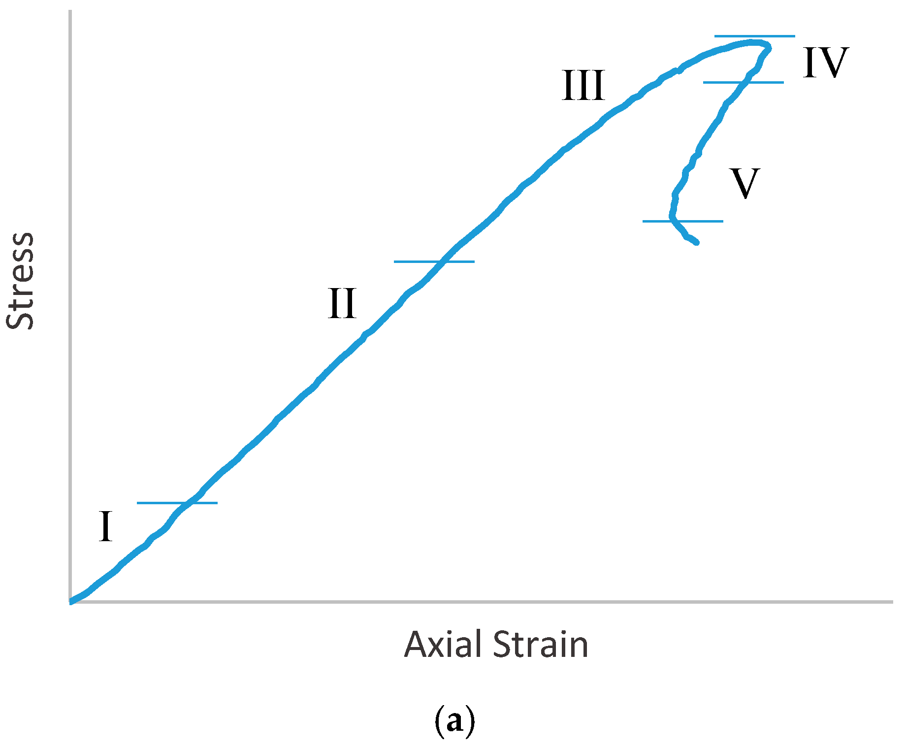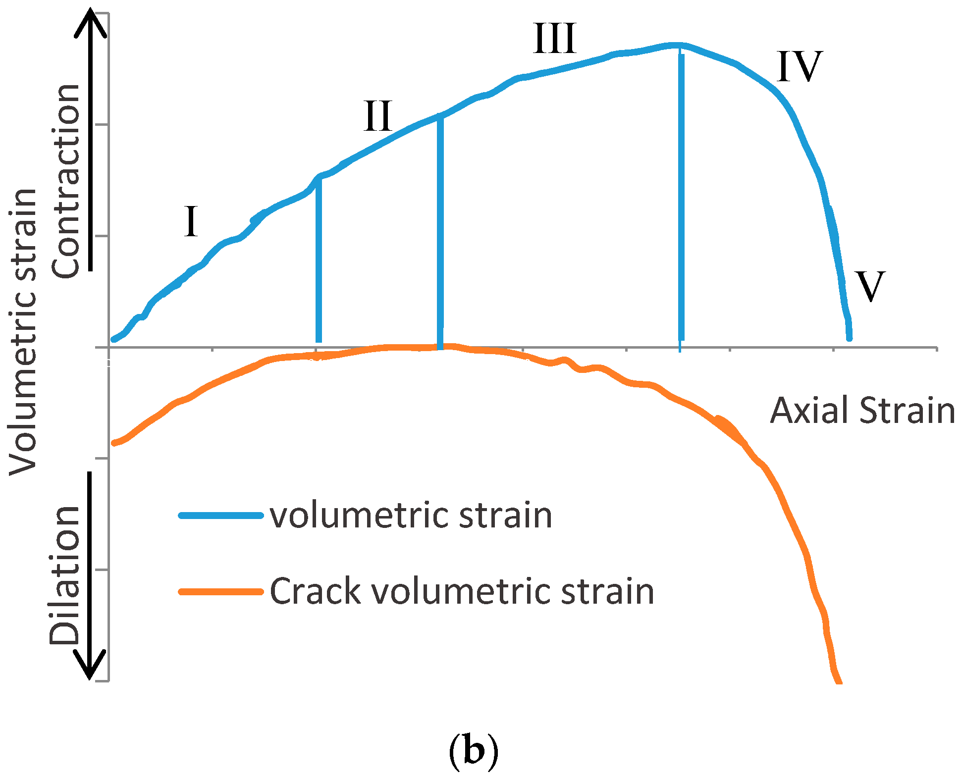 Brittle failure nature of rock has been extensively investigated in the field [73,74,75,76,77,78,79,80] and five major failure regions have been shown (Figure 7). Among them, region I represent the pre-existing cracks close stage in the rock mass, which is dependent on the geometry and the density of microcracks in the rock mass. The closing of the pre-existing cracks enables the rock to be presumed as a damage free linear elastic material having a linear stress-strain relation (Region II) [77]. This elastic region is followed by a non-linear stress variation region in rock, which consists of a combination of random crack formation, crack growth, and sliding of existing crack faces [81]. Region III or stable crack growth region comes next [77], which normally begins when the stress level is around 50% of the peak strength of the rock mass or at the onset of dilation (Figure 7b).