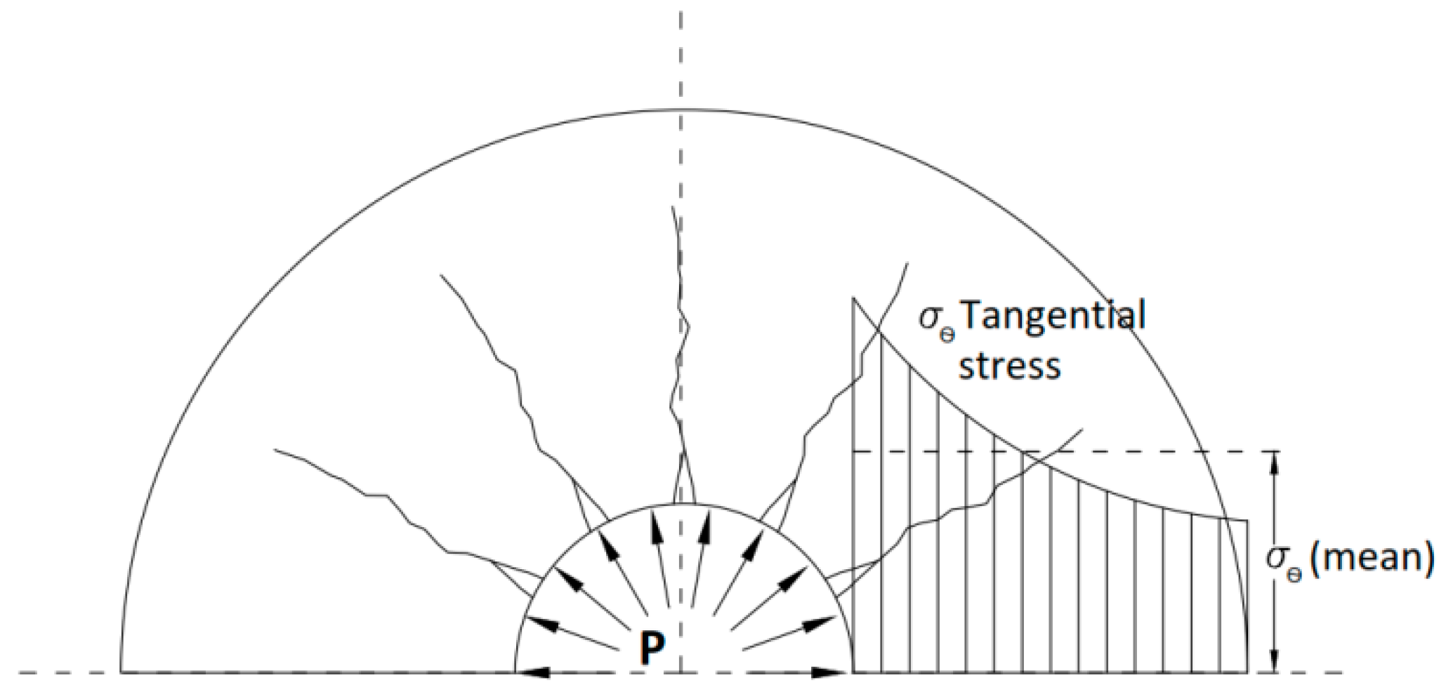 The expansive pressure generated by SCDA in a borehole develops compressive stresses in the radial direction and tensile stresses tangential to the borehole creating a fracture at a point located on the inside surface of the hole with minimal confinement [40] (Figure 9).Though initial cracks appear at the surface of the borehole when the tangential stress reaches the tensile strength of the rock, crack propagation may not occur, because instantaneous tensile stress at crack tip does not exceed the tensile strength of the rock. This is because the applied tangential stress (σθ) reduces with the distance to the borehole (in proportion to the square of the distance) [5].