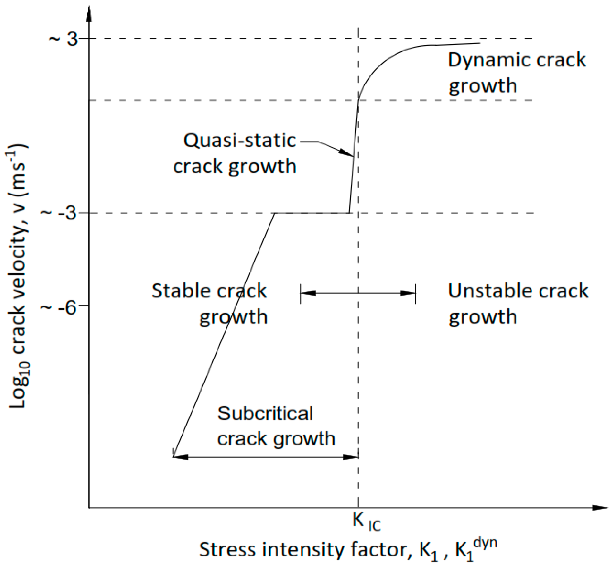 Thus, unlike in hydraulic fracturing, in which fracturing is observed instantaneously as a result of hydraulic pressure directly acting on the crack tip, in SCDA cracking a stable crack growth can be expected. Figure 12 illustrates the possible crack growth states in some rock materials. Because stable crack propagation with low crack velocities can be observed when fracturing rock with SCDA, the quasi-static conditions can be assumed in fracture modelling.