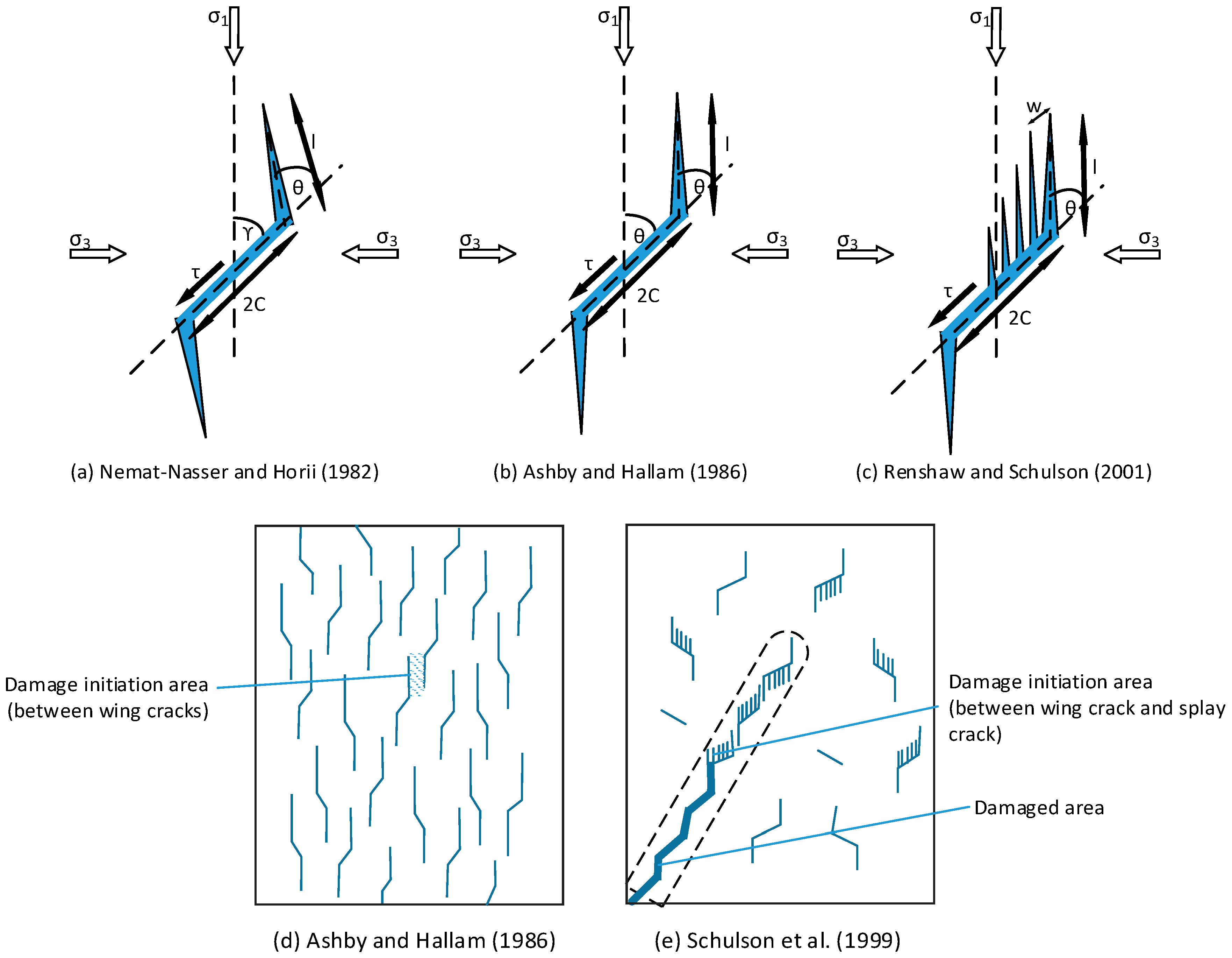 A simple 2D sliding crack model has first been proposed by Brace and Bombolakis [89]. According to this, present cracks in any brittle material extend along a curved path that eventually becomes parallel to the compression axis. Such crack extensions are known as kinks or wing cracks. An initial crack growth model for the extension of wing cracks has been proposed by Kachanov [90] under a compressive stress field by modelling the crack growth with respect to the applied pressure normal to growing wing crack (Table 3). The wing crack was assumed to be initiating from the crack tips of pre-existing microcracks due to the frictional sliding Kachanov [91].