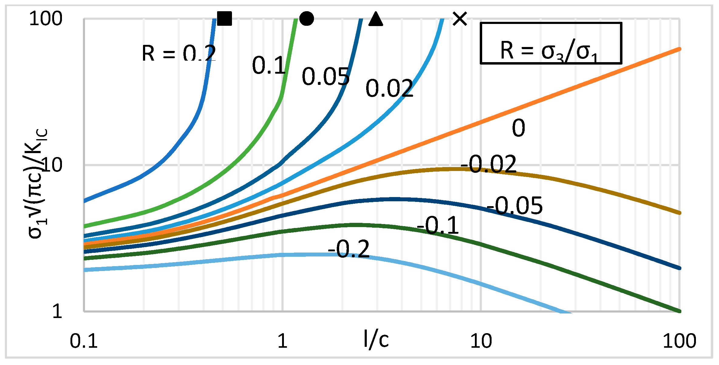 In 1982, Nemat-Nasser and Horii [92] experimentally found the possibility of existing nucleation and propagation of tensile cracks at the tips of existing cracks. Nemat-Nasser and Horii [93] conducted uniaxial compression on plates of a brittle material to investigate the behaviour of a pre-existing planar crack set when it at different orientations to the major principal stress (σ1). The frictional sliding (τ) between the faces was found to produce wing cracks at crack tips, which deviate sharply from the sliding plane and continue to grow steadily towards the axis of major principal stress with increasing compressive strength (see Figure 13). The results are consistent with the basic equation produced by Kachanov [90], according to which the stress required for crack growth increases with increasing length of the wing crack. Results of Nemat-Nasser and Horii [92] was later used in many models as the crack initiation mechanism [94,95,96]. They observed an increasing crack growth after a certain length of the wing crack, which is found to be further accelerated if a tensile stress existed normal to the crack growth direction. According to Ashby and Hallam [97], the existence of a negative confinement ratio (R = −σ3/σ1) may result in unstable crack propagation, because the major principal stress required for crack growth reduces with increasing normalized crack length, l/c (Figure 14). This confirms that accelerated crack propagation in the presence of a far field tensile stress. For the case of expansive pressure generated by SCDA, radial compressive stresses and tensile stresses tangential to the borehole circumference can be observed (Figure 9). Crack growth may occur either radially or in a curved path assisted by tangential hoop stresses applied in the crack opening direction. This implies the possibility of using Nemat-Nasser and Horiis’ [92] plane strain model to describe the failure mechanism of SCDA fracking.