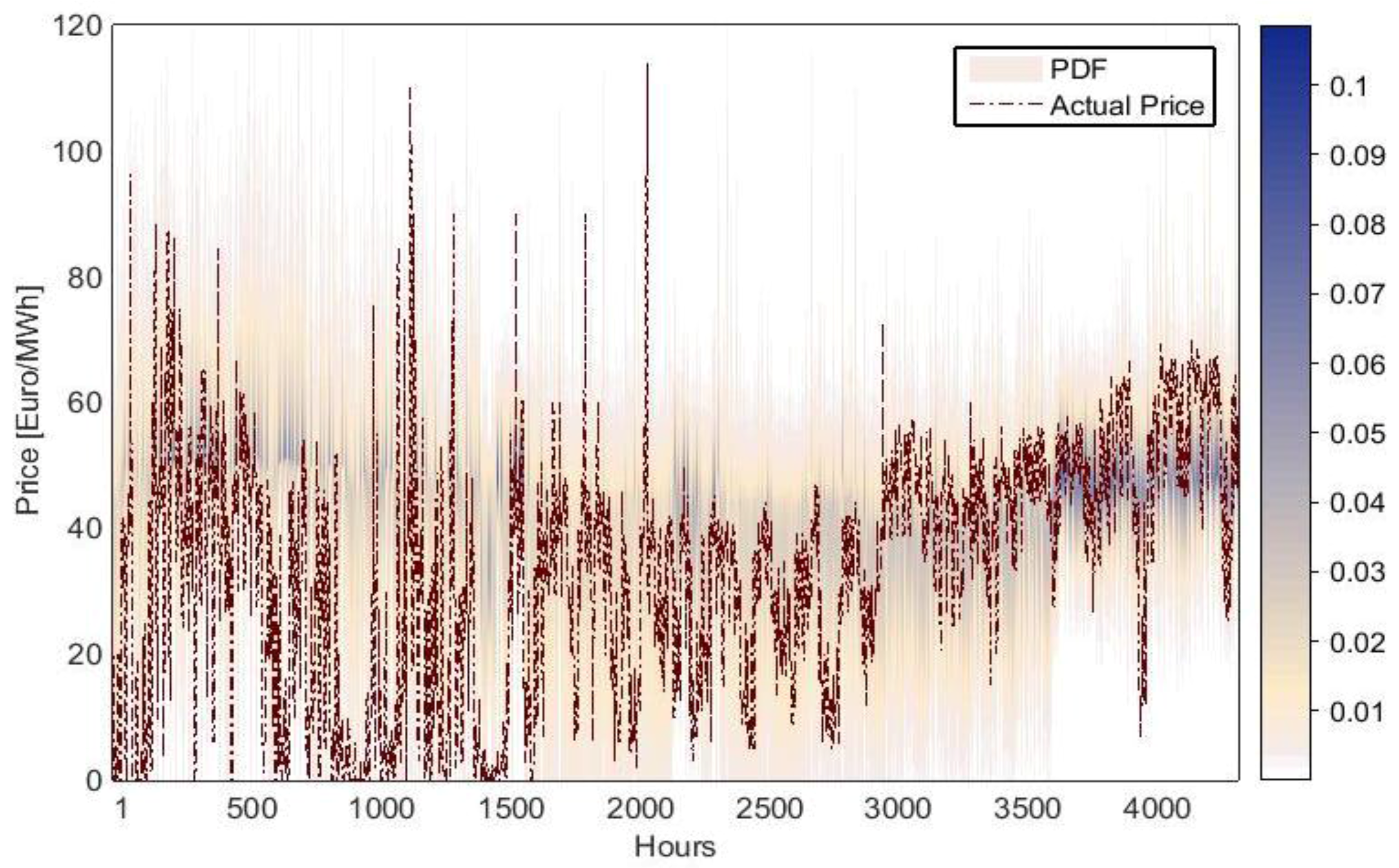 Figure 3 shows the PDFs that have been estimated on an hourly basis with the SEP2 model. The color scale ranges from white (null probability) to blue (the highest predicted probability). It is evident that the actual price always falls within the range of predicted prices. Moreover, the actual price for most days is near the mode value, and the model assigns a high probability of occurrence to it.