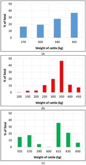 Distribution for the purpose of this study refers to different weight categories of animals getting transported. For example, when feeder animals are transported to feedlots, they come in different sizes and weights. For meaningful interpretation of data, they can be grouped into a few categories. This will also help the user in entering the data into the computer model. This idea applies to finished cattle going to slaughterhouses and cattle transported to or from auction market. However, in the computer model developed as a part of this study, there is no limit on the number of weight categories of animals that can be entered by the user. The data on distribution of animals used in this study are shown in Figure 1. The distribution of animals (a) coming to feedlots; (b) going to (or) coming from auction; and (c) going to slaughterhouses are shown in Figure 1a–c, respectively. It should be noted that the distribution varies widely for the cattle transported to or from auction. The data is typically available on a weekly basis. It should be noted here that the data is highly variable, depending on time of the year, because of differences in calving season, management practices used for raising the animals, and also the climatic conditions. The data for Figure 1a is based on a typical week of cattle auction in Amarillo, TX. The distribution data on feeder cattle are based on USDA-NASS data [2,27] and the cattle going to slaughter are based on USDA data [25].