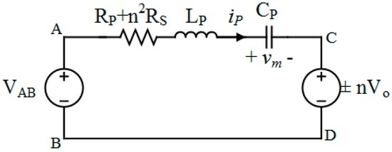 The equivalent circuit shown in Figure 2 is a greater simplification over the equivalent circuit derived in [14,15,16,17]. This is similar to the equivalent circuit of a series-loaded resonant DC/DC converter. Since, and are almost sinusoidal (due to filtering provided by resonant circuit) they can be approximated to their fundamental component using harmonic approximation. Hence,