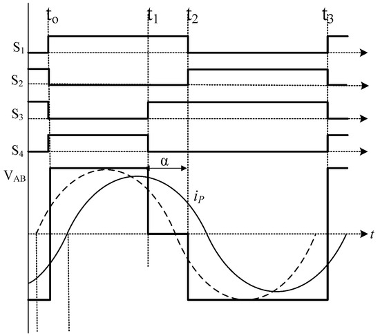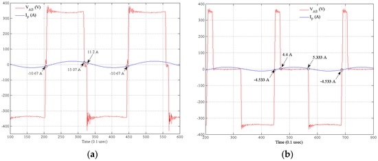 To verify for the ZVS in the inverter switches, the method described in [21] has been used. According to [19], polarity of current at four switching instance (t0, t1, t2, t3) shown in Figure 3 should be according to the Equation (27) for the switches to operate under ZVS condition.