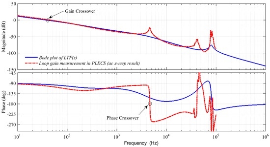 From Figure 6, one can observe that at 40 Hz, the phase boost provided by the PI controller is 6°. Moreover, a gain of –45 dB provided by the PI controller will make the gain of LTF zero at 40 Hz, i.e., crossover frequency of 40 Hz is achieved. Figure 7 shows the Bode plot of the loop gain obtained using the small-signal model (i.e., LTF(s)) as well as the loop gain obtained using the ac sweep of full model simulated in PLECS 3.7.5.