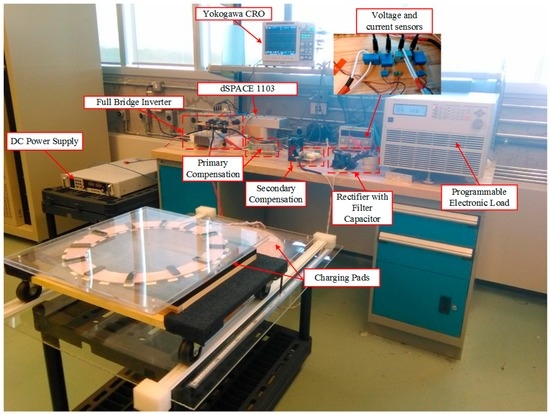 A prototype of the SS compensated IPT system was built in the lab. Table 1 gives the parameters of the experimental setup. Using theories presented in [19,20,21], and depending on availability of capacitors in the market, fS was calculated to be 41.426 kHz for ensuring ZVS for any variation of α, and the primary coil was tuned to a resonant frequency of 39.031 kHz.