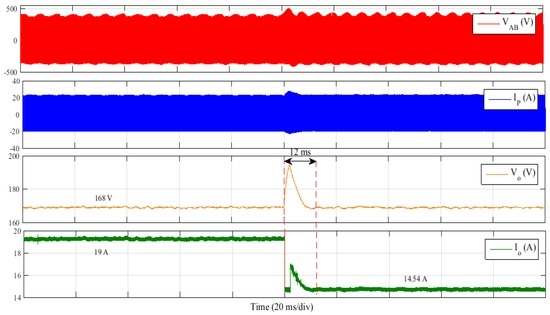 To test the dynamic performance of the designed controller, a step change in the DC load was performed at the fixed reference voltage. For this purpose, the reference voltage was set at 168 V and load was stepped down from 8.84 Ω (3192.76 W) to 11.56 Ω (2441.5 W). Figure 9 shows the transient performance of simulated results, while experimental results are shown in Figure 10. From the results, it can be observed that when the step increase in load is applied, output voltage overshoots and the controller takes corrective action to bring it back to 168 V in about 12 ms in experimental result and 11 ms in simulation result. Voltage overshoot in simulation and experimental results is 9% and 13% respectively.