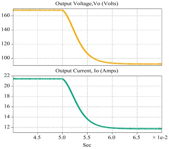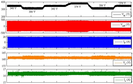 From Figure 13, it can be seen that the controller keeps the output voltage fixed at a reference voltage in spite of variations in the DC input voltage. Since the load is fixed, the output current also remains constant.