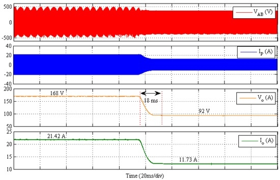 Reference voltage was stepped down from 168 V (rated Voltage) to 92 V at 7.84 Ω load resistance. Figure 11 shows the transient performance of simulated results, while experimental results are shown in Figure 12.