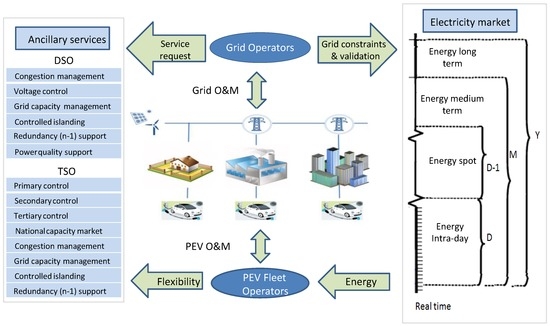 Aggregating PEVs into a PEV fleet (PEVF) is currently one of the most widely recognized approaches for exploiting the synthesized value of PEVs [8,9,10,11]. This approach is also referred to as a virtual power plant and aggregation-based management/integration approach. In comparison to operating a PEV individually, the development of a community/company/national fleet could: (1) offer a more cost-effective charging management of PEVs by taking advantage of the central intelligence of fleet operators (FOs) (such as optimal charging of PEVs in a certain period considering electricity price variation and capacity limitation of charging infrastructure); (2) offer add-on services to PEV owners (such as energy-efficient PEV routing and range maximization); (3) acquire additional value streams by meeting special requirements (such as the minimum size of the bid) of the energy/ancillary service market; (4) lower the cost of PEVs’ purchases; and (5) support better planning of PEV infrastructure. The new aggregation-based entities could be independent or integrated in an existing business function of energy suppliers or grid operators (GOs).