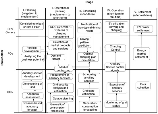 Schematic diagram of stage-based functional processes for EV owners, FOs, and grid operators (GOs) (adapted from [21]).