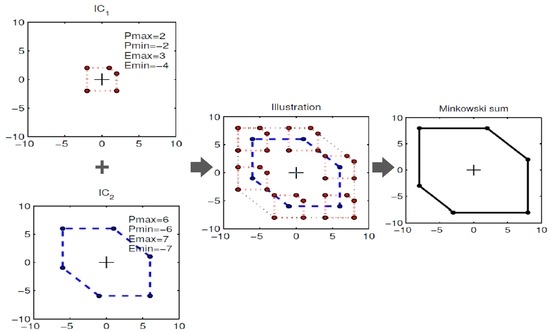 Another approach that can be used for representing the aggregated flexibility more precisely is Minkowski summation [48,49,50]. Constraint sets for the charging rate and the battery storage volume of PEVs are represented as polytopes in high-dimensional Euclidean space. Minkowski summation, formed by adding together the vector of each polytope, is derived to represent the aggregated flexibility in a more generic, mathematical manner. As shown in Figure 5, the flexibility of the two PEV batteries (IC1 and IC2), represented by their constraints, can be summed together to form the representation of the aggregated flexibility [49]. This modular approach supports both visualization of aggregated flexibility of PEVs and applications that use the aggregated flexibility to power system operations through charging management [51]. However, compared to using the lumped battery approach, the computational cost of Minkowski summation can be very high.