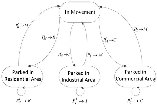 Due to the stochasticity of driving, parametric stochastic models are often used to represent the probability distribution of the information related to driving and charging. Markov chain models [57,58], as probabilistic, stochastic modelling approaches, are currently widely used to model the transition dynamics among driving, parking, and charging. An example from [58] is given in Figure 6 to illustrate the basic idea of a Markov chain model, wherein four different event states (i.e., M-driving, R-parking in residential area, C-parking in commercial area, and I-parking in industrial area) are considered as cyclostationary properties. The corresponding probability functions can be derived based on historical data, if possible; therefore, different kinds of distribution exist. For instance, the dynamic process of a vehicle arriving and leaving a parking lot is described as a Poisson process in [34,59], is assumed to be uniformly-distributed in [33], is presented as a truncated Gaussian distribution in [40,59], and is also represented exponentially for testing its practicality [60]. These parametric models require a further process of parameterization in order to find the corresponding parameters.