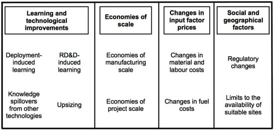 Based on an extensive literature review, this section discusses the main factors influencing the development of the market costs of electricity generation technologies over time. Over the past few decades, much empirical research has sought to explain past cost changes and to attribute these changes to a number of different factors. Initially, and particularly from the late 1970s onwards, studies focused on explaining observed changes in the costs of large-scale fossil fuel and nuclear power plants, with the available cost data usually going back to the 1960s or 1970s. Since around the year 2000, many studies have focused on renewable energy technologies, especially wind and solar PV, with the available cost data typically ranging back to the 1980s or 1990s. This article focuses on 10 factors identified by the literature review as relevant in influencing electricity generation costs in the past. These 10 factors can be grouped into four categories, as shown in Figure 1.