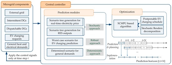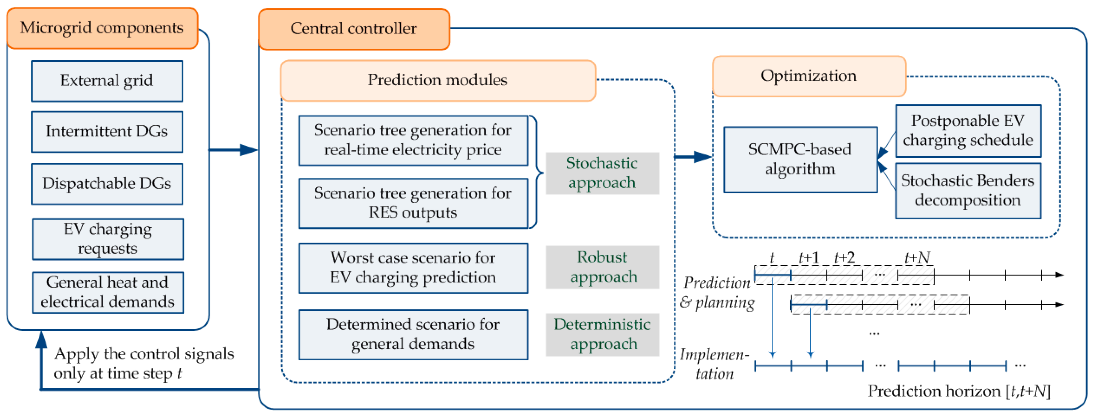 In this paper, we attempt to overcome those limitations mentioned in Section 2.1 by incorporating scenario-based MPC with forecasts on the various uncertainties. This paper presents an innovative energy management approach for optimizing the economic performance of a combined heat and power microgrid with EV integration. The key figure of merit is to include the predictable but uncertain variables in a receding horizon manner while retaining the computational complexity within the scope of acceptability. By building on a modified scenario-based MPC algorithm together with stochastic, robust, and deterministic models, different feasibilities of predicted variables are able to match with an MPC-based approach.