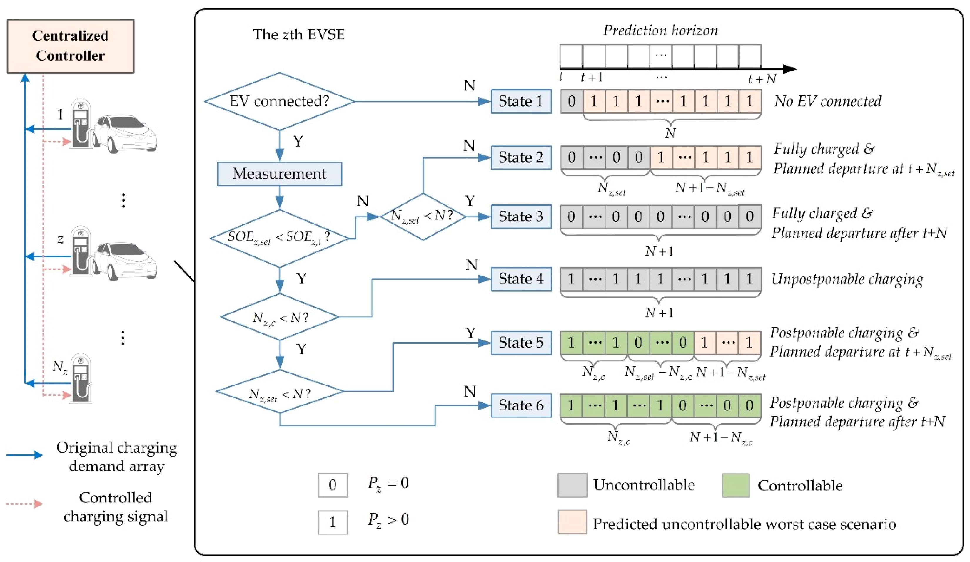 At each time step t, every EVSE measures its EV connection state and parameters automatically. A state criterion with six possible states of the charging process can be generated in the prediction horizon [t,t+N] as shown in Figure 2. Notice that the charging behavior binary labeled in Figure 2 is arranged by the original order before DSM. To begin with, an EVSE detects whether there is an EV connected. If not, this EVSE is regarded to be in State 1. When there is a connected EV, measure the current state of energy SOEz,t, the charging power Pz, and fetch the value of SOEz,set and Tz,set. Since time is separated into discrete Δt, Tz,set sometimes need to get rounded to an integer by executing Nz,set = ceil(Tz,set/Δt). If the desired SOEz,set is achieved, which means the connected EV is fully charged, compare whether the planned departure time step Nz,set precedes the prediction horizon N or not, where State 2 represents that the EV is going to leave the connected EVSE within the prediction horizon, and State 3 otherwise. If SOEz,set has not been achieved, the difference of SOEz,set and SOEz,t denotes the needed sum of charging time step Nz,c before the EV departures as: