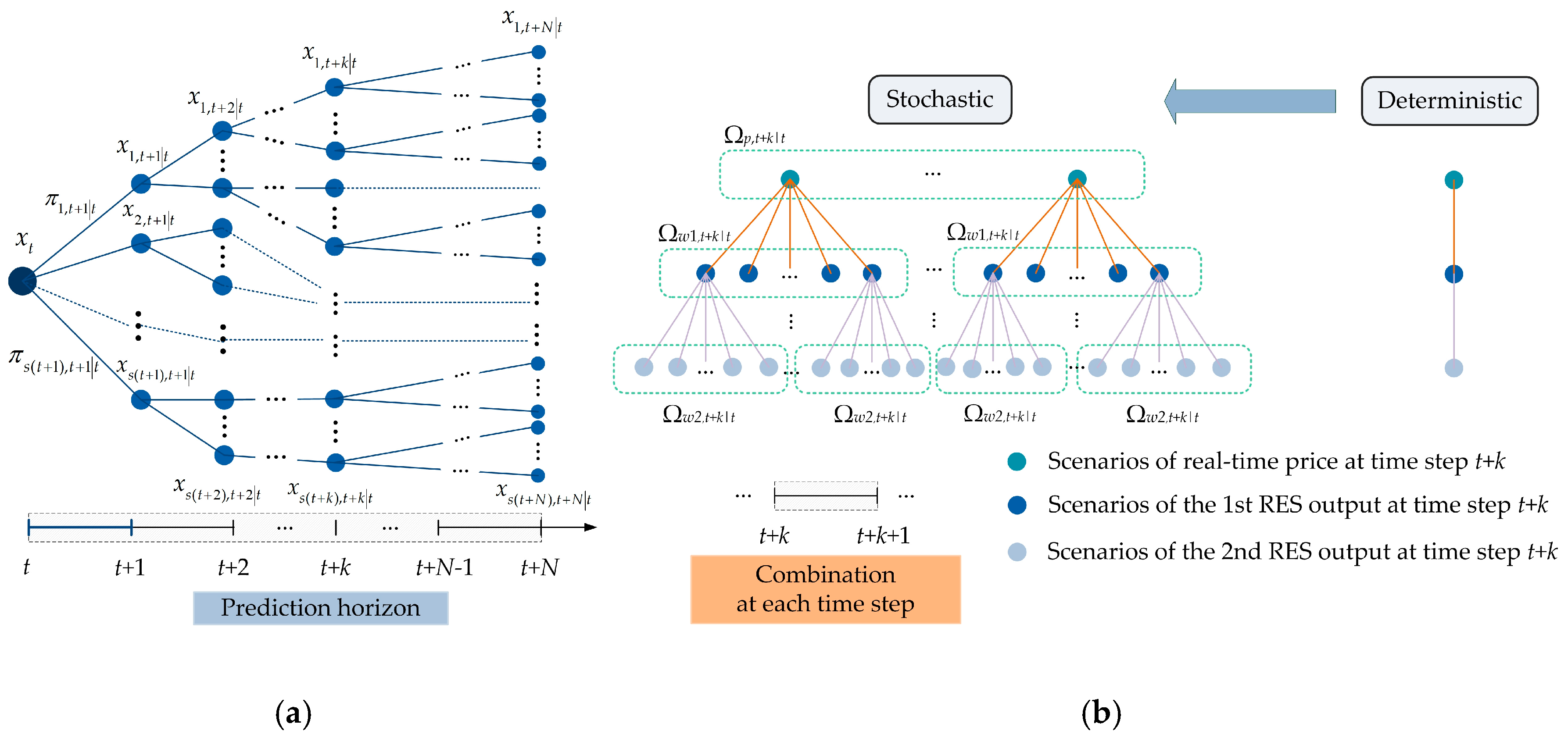 For uncertainties with relatively accurate prediction models, stochastic approaches allow for the closer imitation of predictions. The so-called scenario tree method has been successfully applied to stochastic models, such as real-time electricity prices, outputs of WTGs, and other RESs. A scenario tree representing uncertainties with a tree of discrete scenarios is shown in Figure 3a with a general structure. In a scenario tree, each node represents a possible state at its particular time step and has only one predecessor, but multiple successors. The root node represents the initial state, and a forward branch from the root node to a leaf node describes a probability-weighted realization. The probability can be even or not, providing a causal but compact representation of the uncertainties acting on the system. A discrete-time formulation for a scenario tree can be written as: