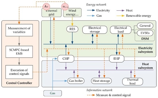 Electricity demand is divided into two parts: (a) general electricity demand Ee,t; and (b) EV charging demand Eev,t, respectively. The supply side of the electricity subsystem covers the RES output, CHP-produced electricity, scheduled ESS discharging, and purchased electricity from the external grid Eex,t. These supplements cover the total electricity demand, as well as the scheduled ESS charging energy and EHP-consumed electricity. Similarly, the supply side of the heat subsystem, including the heat production of the CHP, EHP, boiler, and scheduled thermal storage charging, should meet with the heat demand Hq,t and discharging of the thermal storage. The co-generation and re-allocation between electricity and heat flows, such as CHPs and EHPs, bring about an interaction in both power flows. The equilibrium of production and consumption in the two energy subsystems must be satisfied simultaneously at every time step t: