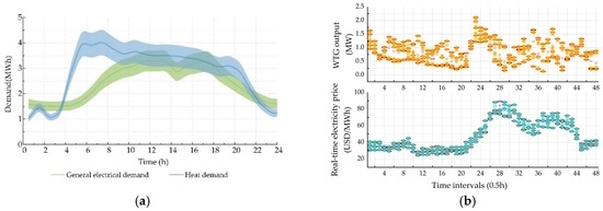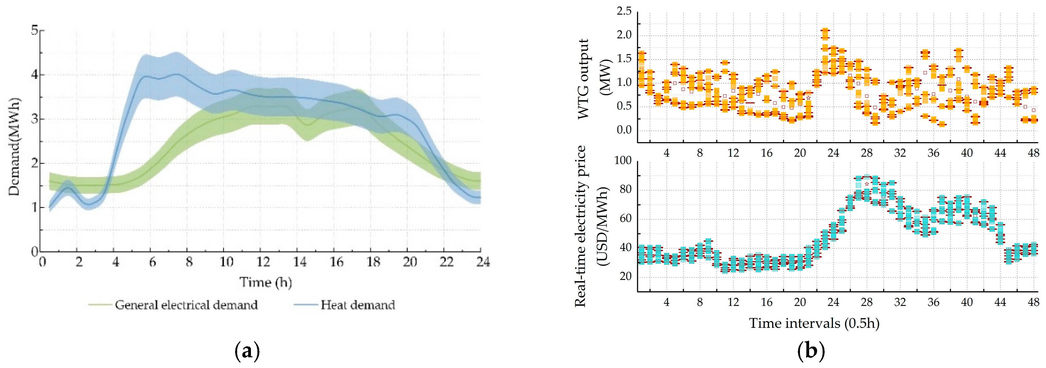 A total analysis horizon of 24 h is adopted here. The distributions of scenarios with probabilities for the WTG output and the real-time electricity price are shown in Figure 5a. The heat and general electricity demand predictions are treated as a forecast with a standard deviation range εd of 25%, as shown in Figure 5b. The gas price is treated as a constant value of $49.2 USD/MWh.
