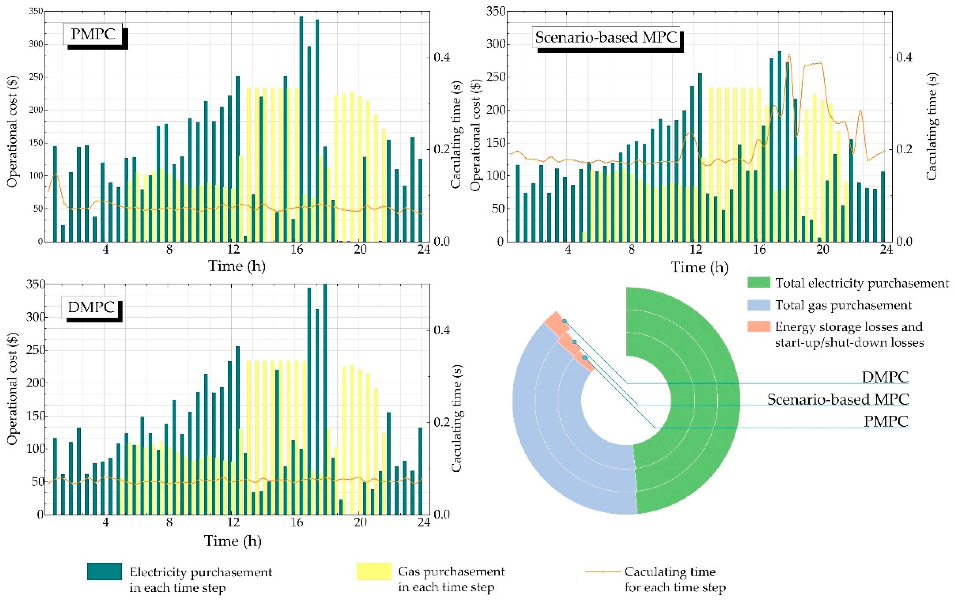 Figure 6 shows the results of these three approaches. PMPC with perfect future information attains a prominent behavior of overall expenditure, as expected. The accumulated operating cost for the proposed scenario-based MPC is $10,898.07 USD/day, which is the closest to PMPC, and saves the cost of 0.955% in the analysis horizon compared with DMPC. As to the computing time, no major difference is detected between DMPC and PMPC since both of them equivalently contain only one scenario. However, there is an observable deceleration of the convergence speeds for scenario-based MPC compared with the others due to the involvement of many more scenarios than the traditional one-scenario procedures. It is clear that when prediction uncertainty is inevitable in general, scenario-based MPC outperforms in reducing the total operating cost compared to DMPC at the expense of the computing time.