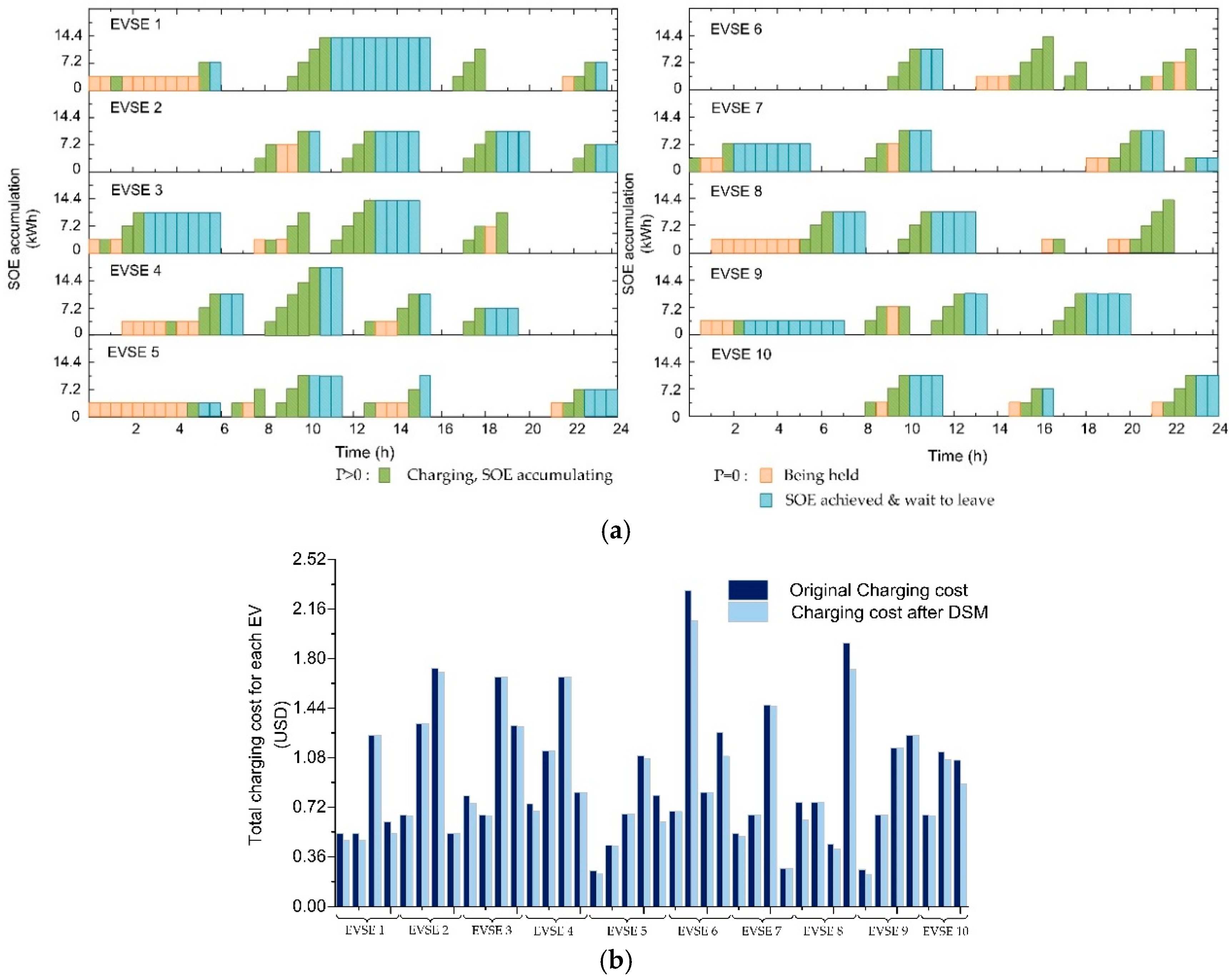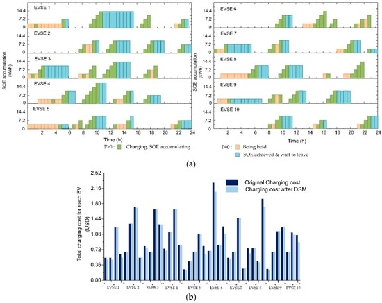 Scheduled EV charging of each EV connected to the installed EVSEs: (a) charging behavior schedule with accumulated SOE; and (b) charging cost.