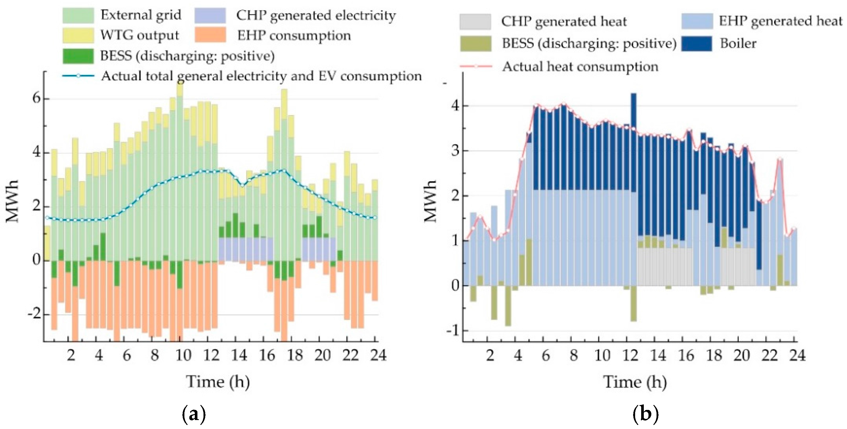 Illustration of energy supply-demand dynamics by scenario-based MPC: (a) balance of electricity flow; and (b) balance of heat flow.