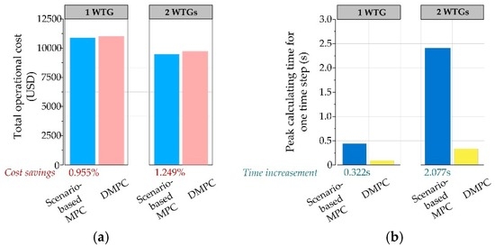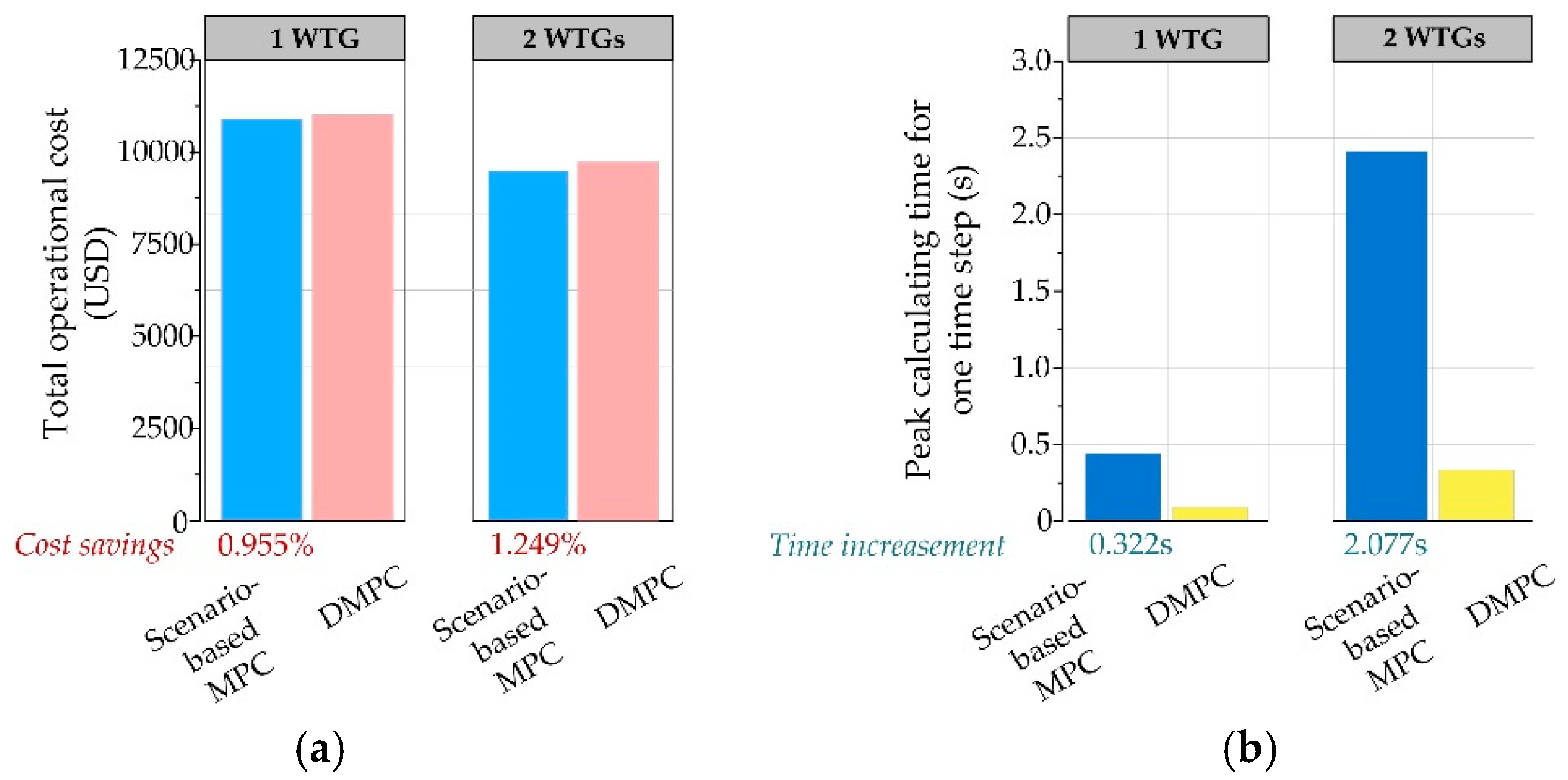 As concluded, the proposed scenario-based MPC approach gains a lower operational cost but consumes more computing time. With the trend of progressive RES penetrations, this study case is simulated to investigate the importance of considering the computing performance while maintaining a good economic performance of scenario-based MPC. Assume that two WTGs with the same parameters are installed in the microgrid above, sharing dissimilar meteorological environments which lead to diverse wind speed scenarios. Figure 9 depicts the total operational cost and the peak calculating time for one time step in the whole simulated analysis horizon (N = 16). When uncertainties in the microgrid increase, the gap of the total operational cost between scenario-based MPC and DMPC also increases; in this particular case study, the cost savings rises from 0.955% to 1.249%. However, there is a significant drawback of the computing time observed, where the peak calculating time increase rises from 0.322 s to 2.077 s. A similar situation happens if more units of RES are integrated, since the problem dimension increases inevitably on account of more scenarios in the scenario combination.
