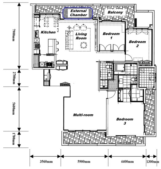 Full scale measurements of thermal performance were taken at an apartment building in South Korea. The apartment building is a seven-story reinforced concrete building, constructed in 2013. The building has a rectangular floor plan and its area is 180 m2, with a 3 m floor height. The apartments comprise three bedrooms, two living rooms, a kitchen, and two bathrooms. A plan of the apartment building used for the measurements is shown in Figure 1. The thermal performance measurements were taken over five days from 1 to 5 November. During this period, the outdoor temperature and relative humidity ranged from 7 °C to −20 °C and 27% to 70%, respectively.