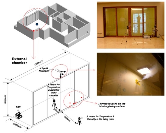 In the study, particular attention was paid to the control of the environment of the window system by varying the temperature from −15 °C to −20 °C in an external chamber system. To this aim, an external chamber was installed in the balcony space (Figure 3). The chamber, with dimensions of 1 m width, 3.8 m length, and 3.0 m height was tightly lined with 12.5 mm gypsum board and a 65 mm layer of insulation. In the chamber, the temperature in the balcony space was controlled using liquid nitrogen. Liquid nitrogen was set to be released in order to decrease the temperature by 10 °C every hour. By using liquid nitrogen, the temperature was determined so that condensation on the inside surface of the window system would occur in a steady state condition. During the measurement period, three 200 L cylinders of liquid nitrogen were used and each lasted approximately 4 h. A small fan was installed to mix the nitrogen gas with the air in the chamber.