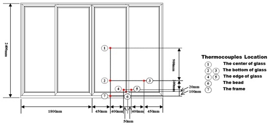 As shown in Figure 3, two hygro-thermometers were located in the living room and the chamber to measure the air temperature and humidity. For the window system, 14 thermocouples were used and each of the seven sensors was located in the same position of the exterior and interior surfaces of the window system (Figure 4). On each surface of the glass, five sensors (sensors 1 to 5) were mounted on the glass and two sensors (sensors 6 and 7) were located on the glass bead and frame, respectively. These measurements were taken every 5 min.