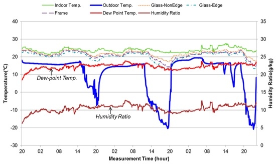 From 21 h to 24 h on the last day of measurement (Figure 8), the temperature in the living room was maintained to within the range of from 23 °C to 23.5 °C with the increase of humidity from 61% to 63%. In addition, the temperature ranges on the glass, the glass-edge, and the frame were 18 °C to 19 °C, 12.5 °C to 13.5 °C, and 14.6 °C to 16.6 °C, respectively, while the temperature in the chamber was maintained to below −18 °C. The occurrence of condensation on the interior glass surface was observed when the temperature of −18 °C was maintained in the chamber for 2 h from 22 h.
