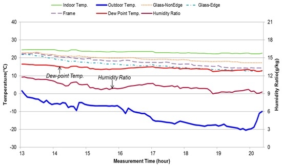The Ministry of Land Infrastructure and Transport of South Korea has set a design standard to prevent condensation on window systems. According to the standard, the condition of the outdoor temperature must be −20 °C, and the indoor relative humidity should be 50%. Generally, the humidity levels in residential buildings vary according to the activities of the occupants. Although the humidity level may be set to 50% in order to prevent condensation, the housing can have higher humidity levels. The indoor humidity levels ranged from 50% to 65% and thus, the occurrence of condensation was observed during the experiment in this study.