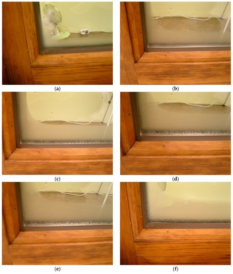 Occurrence of condensation on the glazing with the increased indoor humidity from 23 h to 24 h on the fourth day of measurement. (a) Chamber −17.7 °C, Indoor 23.4 °C/61%, Glass edge 13.4 °C (23:00 on the fourth day). Length of thin moisture film: 40 mm; (b) Chamber −18.7 °C, Indoor 23.3 °C/62%, Glass edge 12.8 °C (23:15 on the fourth day). Length of thin moisture film: 45 mm; (c) Chamber −17.9 °C, Indoor 23.2 °C/62%, Glass edge 12.5 °C (23:30 on the fourth day). Length of thin moisture film: 50 mm; (d) Chamber −20.6 °C, Indoor 23.2 °C/62%, Glass edge 12.2 °C (23:45 on the fourth day). Length of thin moisture film: 50 mm; (e) Chamber −19.1 °C, Indoor 23.3 °C/63%, Glass edge 12.2 °C (24:00 on the fourth day). Length of thin moisture film: 60 mm, water droplets: 5 mm; (f) Chamber −17.8 °C, Indoor 23.4 °C/63%, Glass edge 12.2 °C (24:15 on the fourth day). Length of thin moisture film: 70 mm, water droplets: 5 mm.