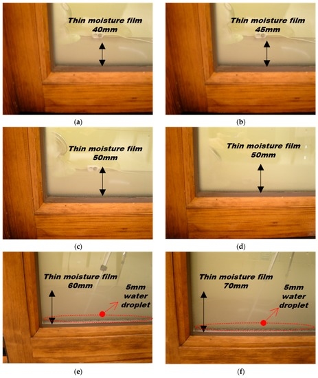 From the glass edge, a thin moisture film was formed and the length of the film is approximately 15 mm. As the temperature of the chamber was decreased from −15 °C to −15.6 °C, the moisture turned into water droplets from 18 h. In addition, Figure 7c,d clearly show water drops on the interior glass surface when the temperature of the chamber was maintained at −18 °C from 19 h to 20 h, while the temperature and humidity in the living room remained in the range of 22.5 °C to 22.6 °C and 55% to 57%, respectively. When the temperature of the chamber decreased to −20 °C, water droplets of approximately 10 mm in length were clearly observed on the interior glass surface and the length of the thin moisture film increased to 40 mm (Figure 7e,f).