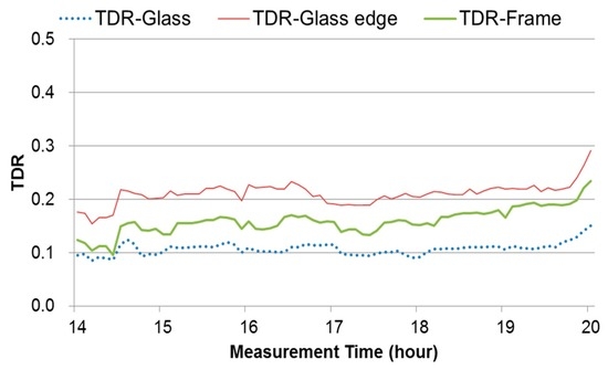 In this study, the values of TDR were obtained using the measurement temperature data on the glass, glass-edge, and frame as shown in Figure 10 during the third day of measurement. Thus, the average values of TDR on the glass, glass-edge, and the frame were 0.11, 0.21, and 0.16 for various temperatures in the chamber.