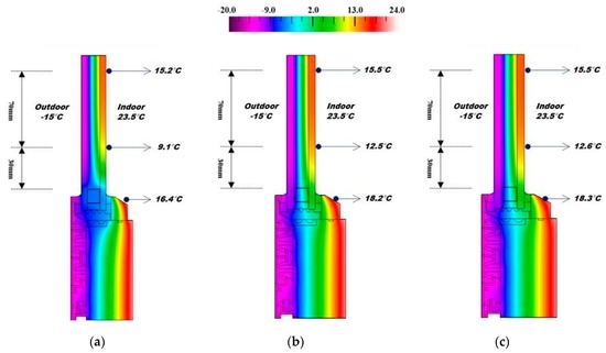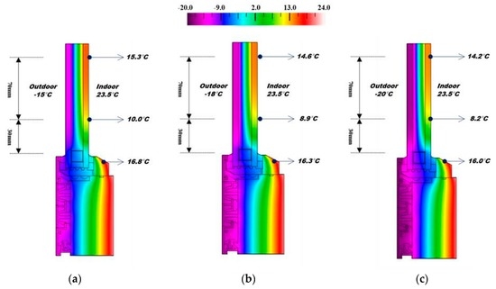 Indoor surface temperature on the window under the various outdoor temperatures using the simulation. (a) Outdoor temperature: −15 °C; (b) Outdoor temperature: −18 °C; (c) Outdoor temperature: −20 °C.