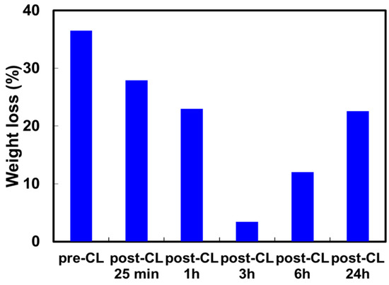 QPVA is a water-soluble synthetic polymer. To maintain QPVA membrane stability in hot water, we used two different methods to form the crosslinked membranes, the pre-cross-linking (pre-CL) and post-cross-linking (post-CL) methods. The weight losses of the pre-CL membrane and the post-CL membranes are shown in Figure 1. This indicates that the post-CL membrane with 3 h crosslinking time demonstrated the least weight loss among the tested membranes. Hence, the following results are based on the samples with 3 h crosslinking time and denoted as CL-QPVA.