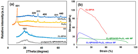 (a) X-ray diffraction (XRD) patterns of graphene oxide (GO), iron oxide (Fe3O4), graphene oxide-iron oxide (GO-Fe3O4), CL-QPVA and un-aligned CL-QPVA/GO-Fe3O4 membranes; and (b) stress–strain curves of the CL-QPVA and CL-QPVA/GO-Fe3O4 composites prepared with and without the magnetic field (MF).