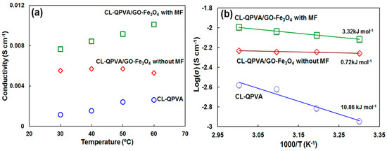 We indicated in our previous reports [17,45,46] that the addition of nanofillers to PVA-based membranes resulted in enhanced ionic conductivity due to higher free volume in the polymer matrix. The nanofillers interrupted the polymer crystal structure and increased the polymer amorphous region, which facilitated ion passage. The magnetic field-free sample reflected a similar effect. As the GO-Fe3O4 was aligned, more ion transport routes were induced, such as surface diffusion and hopping mechanisms [41]. Therefore, the aligned QPVA exhibited even higher ionic conductivity (Figure 3a). At elevated temperatures, the conductivity increased due to higher ionic mobility (i.e., diffusivity) and the ions could pass through the polymer free volume with ease.