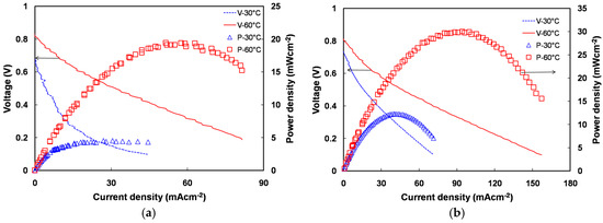 Direct methanol alkaline fuel cell (DMAFC) voltage (left axis) and power density (right axis) as a function of the current density at 30 °C and 60 °C using (a) CL-QPVA membrane and (b) CL-QPVA/GO-Fe3O4 composites prepared without a magnetic field fed with a 1 M methanol anode fuel in 6 M KOH. Cathode: humidified oxygen with a flow rate of 100 mL·min−1. Gas diffusion electrodes (GDEs): catalysts of 6 mg·cm−2 Pt-Ru/C for the anode and 5 mg·cm−2 Pt/C for the cathode on microporous layer (MPL)-free carbon cloth.