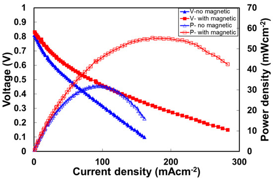 DMAFC voltage (left axis) and power density (right axis) as a function of the current density at 60 °C using CL-QPVA/GO-Fe3O4 composites prepared with and without the magnetic field. GDEs: catalysts of 6 mg·cm−2 Pt-Ru/C for the anode and 5 mg·cm−2 Pt/C for the cathode on MPL-free carbon cloth. Anode fuel: 2 M methanol in 6 M·KOH with a flow rate of 5 mL·min−1, cathode: humidified oxygen with a flow rate of 100 mL·min−1.