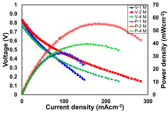 Furthermore, we fed more concentrated methanol fuel to the DMAFC to compare the power densities using the aligned QPVA composite. The OCV at 1 M, 2 M and 4 M methanol fuels were 0.83, 0.85 and 0.77 V (Figure 7). The 1 M and 2 M methanol resulted in similar OCV values whereas the 4 M fuel had a reduced OCV. The peak power densities with 1 M, 2 M and 4 M methanol fuels were 31.9, 55.4 and 23.5 mW·cm−2, respectively. We have already mentioned that increasing the methanol concentration would also increase the methanol oxidation rate and generate electrical current. However, there is a limit to increasing the methanol concentration. When we raised the methanol concentration beyond a certain value, the un-reacted methanol would crossover to the cathode. This may result in a mixed potential, catalyst poisoning, and deterioration in the cell performance.