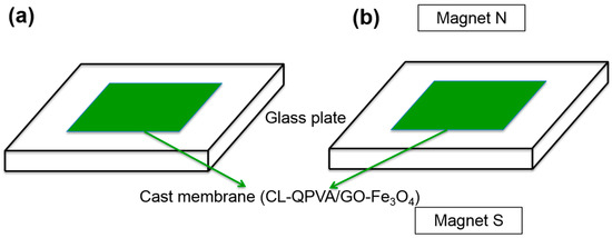 Illustration of CL-QPVA/GO-Fe3O4 nanocomposite membranes (a) prepared without the magnetic field; and (b) prepared with the magnetic field. The magnets are placed above and below the cast film until the membrane solidified.