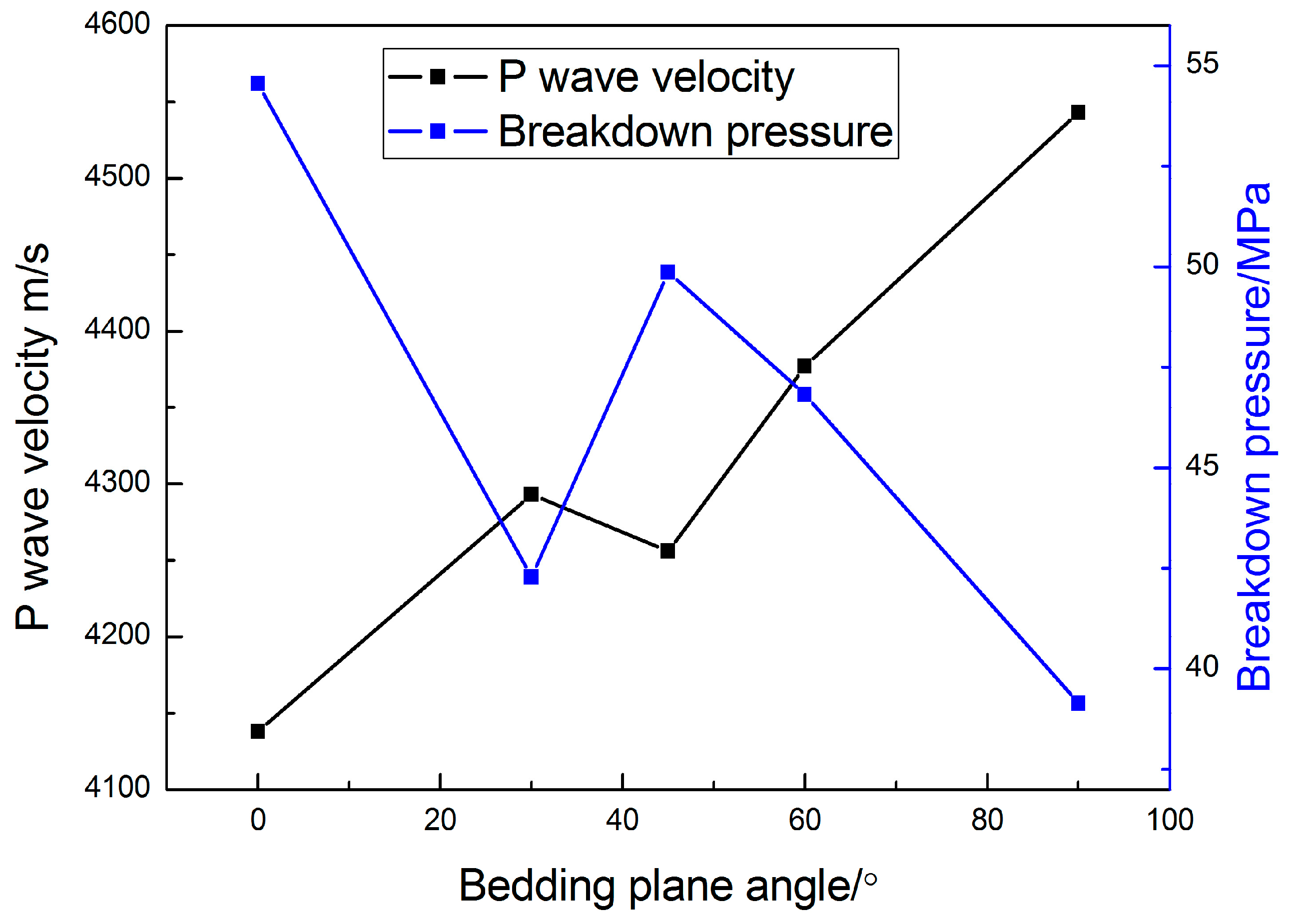 | Bedding Plane Angle | Density (g/cm3) | Average P Wave Velocity (m/s) | Uniaxial Compressive Strength (MPa) | Tensile Strength (MPa) | Breakdown Pressure (MPa) | |