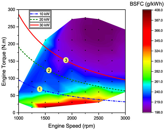 Figure 5 shows the SI engine’s BSFC map based on the data from [41]. This figure demonstrates that the selected engine operating points (i.e., points # 1, 2, 3) are located in the lowest BSFC region of the SI engine.